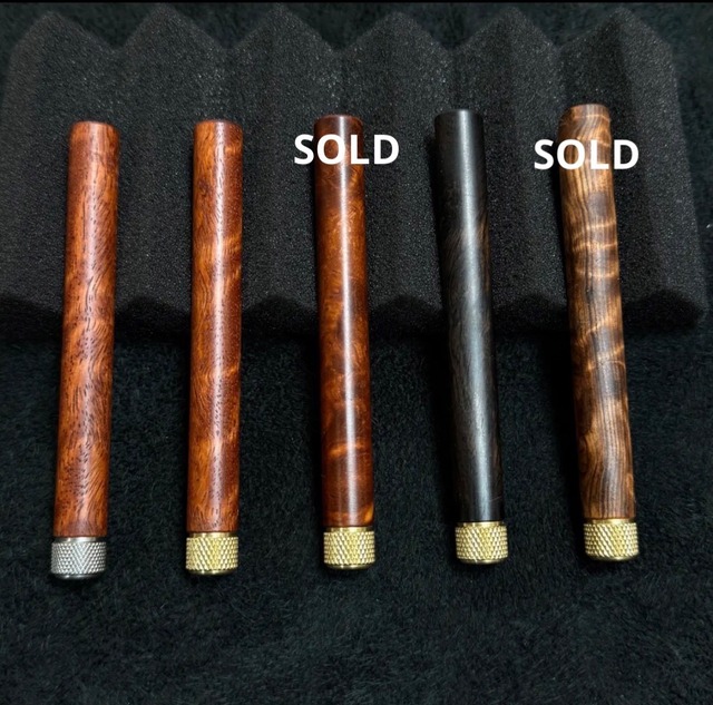 【Enjoy freely】の通常シャーペン用木製後軸パーツです① ⭕️中間パーツ不要タイプ ⭕️こちらは木軸だけの販売になります。 内部機構はご自身でご用意ください。 P205はこちらでもご用意出来ます。 (ペンクリップは最初からセットしています) 写真向かって左から1〜5です。 1デザートアイアンウッド 2栃縮杢スタビ 3メープルバールスタビ 4紅木 5メープルバールスタビ ◉オイルフィニッシュ(osmo) (黒柿は無塗装) ◉木軸内部パーツは超超ジュラルミン製です。 (木軸は超超ジュラルミンのメタルタイプ後軸より軽量です) 内部機構はぺんてるP205や、参考写真のような同じ形の口金のがお使いいただけます。 ⚠️①ペン尻の穴は試したシャーペンの中で一番大きいP205の直径に合わせています。(最大直径差約0.2mm) ②口金部分の直径はほぼ同じでしたが一番小さいP205に合わせています。 他のは同心円上の微細な誤差があるものもありますので指で触れば分かるくらいの段差が出る場合があります。 【価格について】 材の取りが良くないのもありますが、PG-5用の短い木製後軸より作りやすいので同等価格を設定しています。 (申し訳ございませんがペンクリップ代200円は含んでおります) 【発送方法】 ⭕️宅急便コンパクト(補償あり・追跡番号あり)か、ゆうパケットポストmini(補償なし・追跡番号あり)でお送りさせて頂きます。 ※どちらかお選びください。