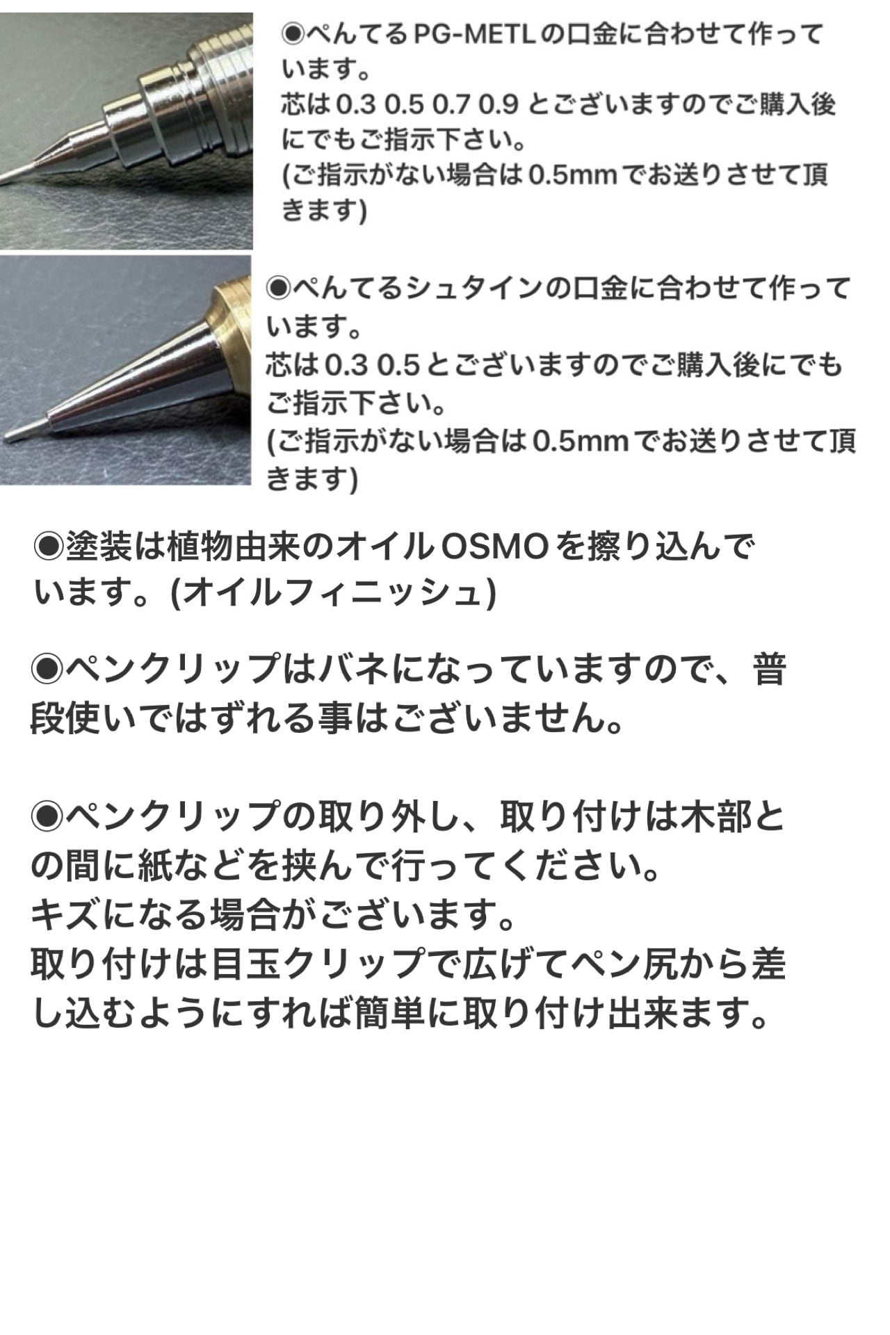 時々オーダーのお問い合わせを頂くのですが、ペンブランクから見て頂いて、重さや細かい仕様を決めて頂くフルオーダーは現在お受けしていませんので、簡単な事ではございますが、先端金属のタイプ、持ち手の直径(先端からの位置)の簡易セミオーダーを試験的に行わせていただきます。
