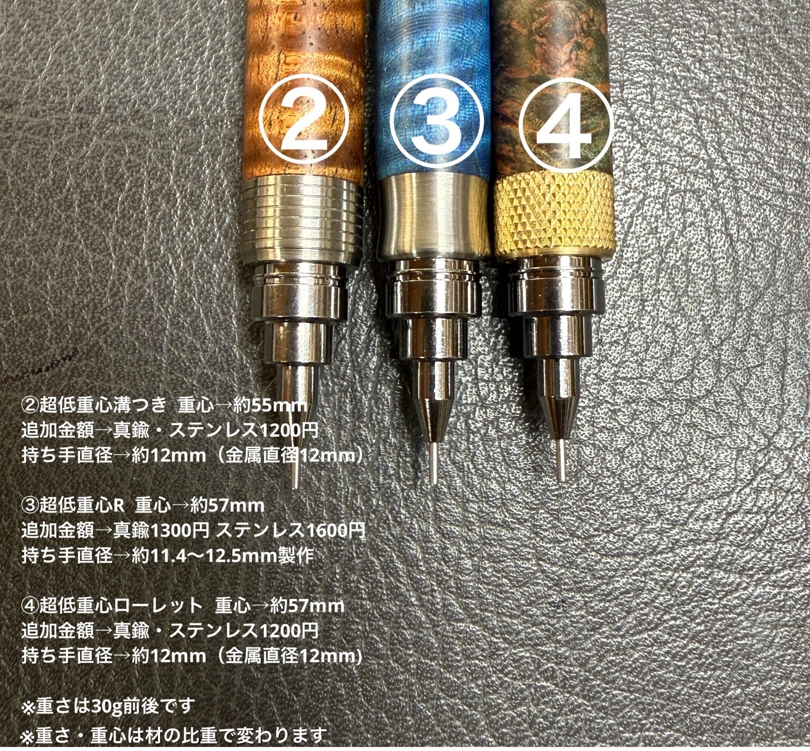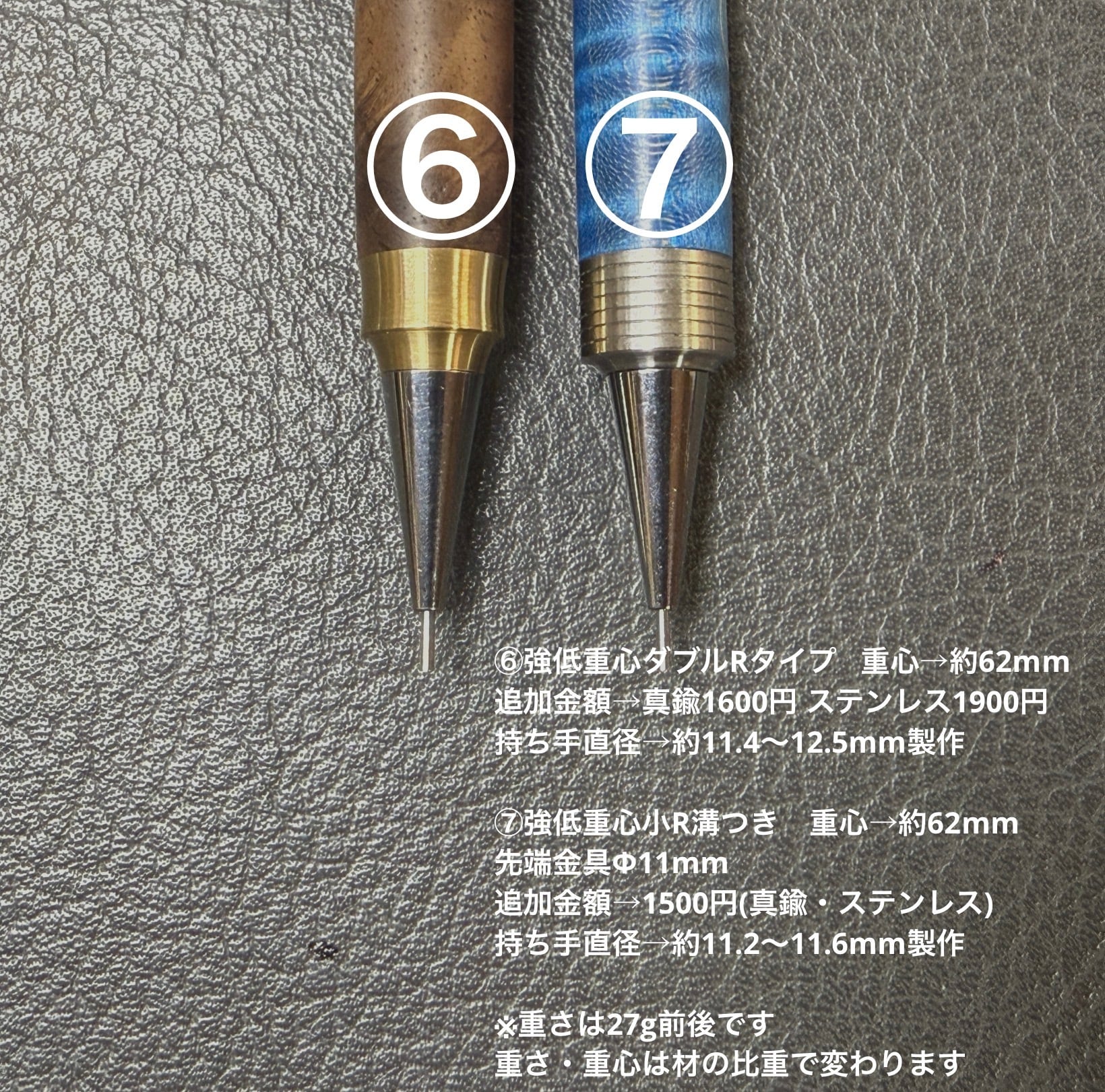 時々オーダーのお問い合わせを頂くのですが、ペンブランクから見て頂いて、重さや細かい仕様を決めて頂くフルオーダーは現在お受けしていませんので、簡単な事ではございますが、先端金属のタイプ、持ち手の直径(先端からの位置)の簡易セミオーダーを試験的に行わせていただきます。