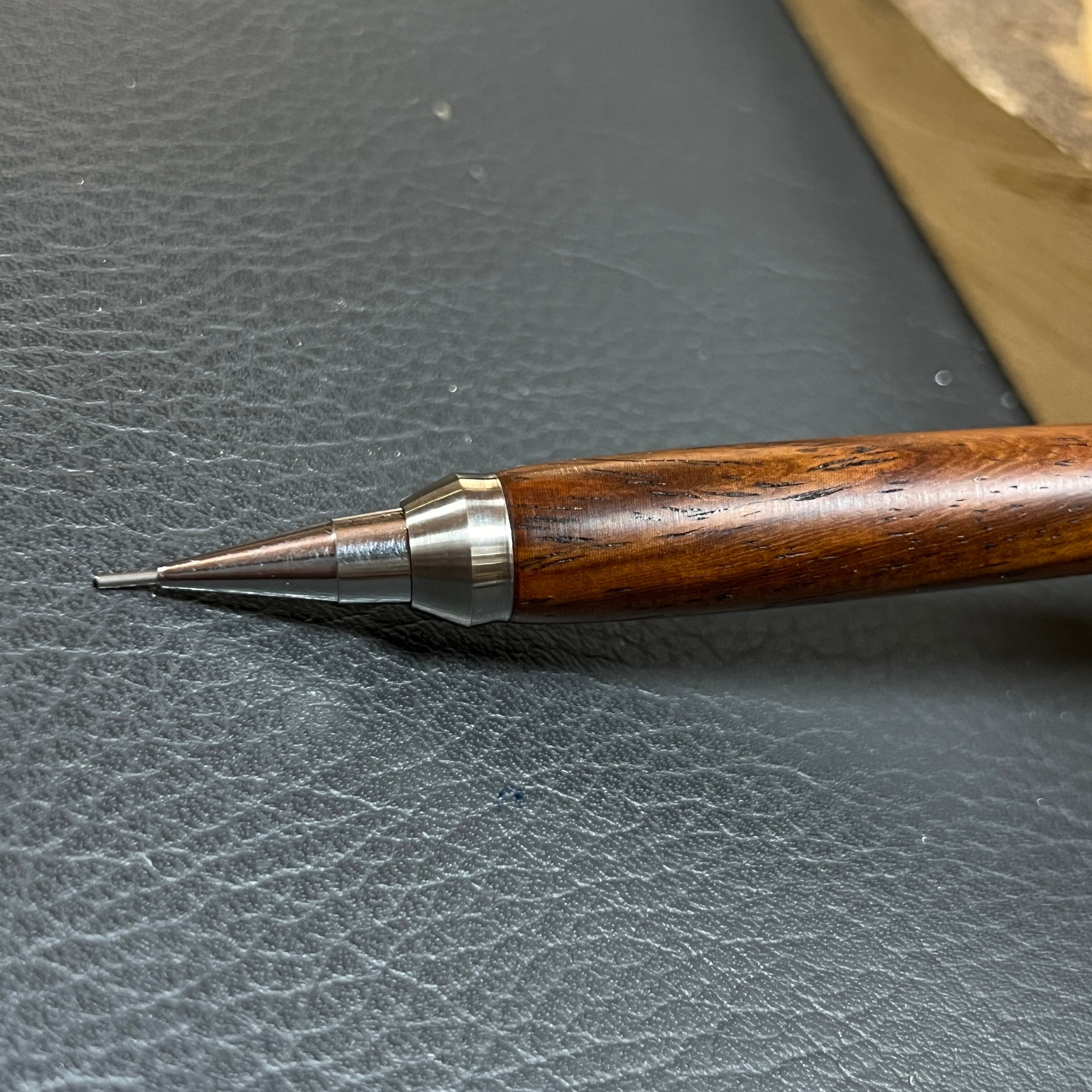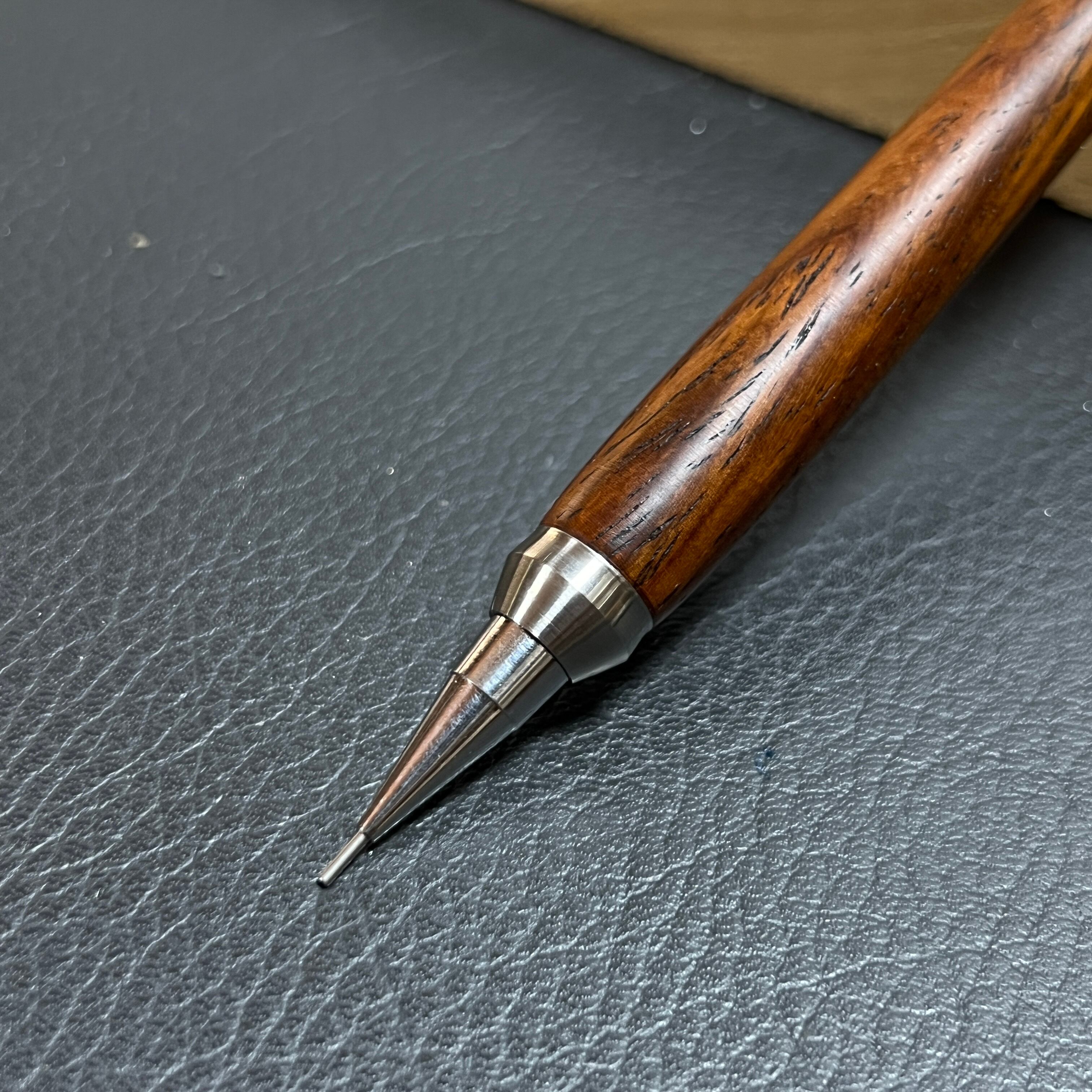 重心はカスタムパーツ(真鍮・ステンレス)を取り付けて通常のシャーペンの強低重心と同じ位に調整しています。